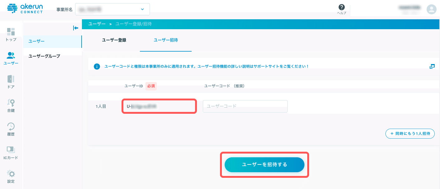 Note:Akerunのユーザー招待は、Akerun Connectから行うこともできます。Akerun Connectのサイドバーから[ユーザー]>[ユーザー]を選択すると表示される画面で[ユーザーを登録・招待]をクリックし、お客さまのAkerunユーザーIDを入力して[ユーザーを招待する]をクリックします。