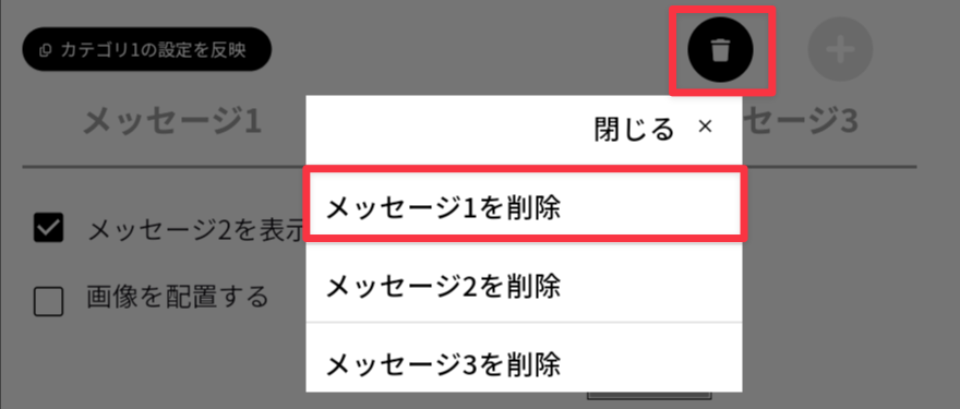 Note:メッセージの設定を削除するには、メッセージの設定画面でごみ箱アイコンをタップし、表示されるメニューから削除対象のメッセージをタップします。