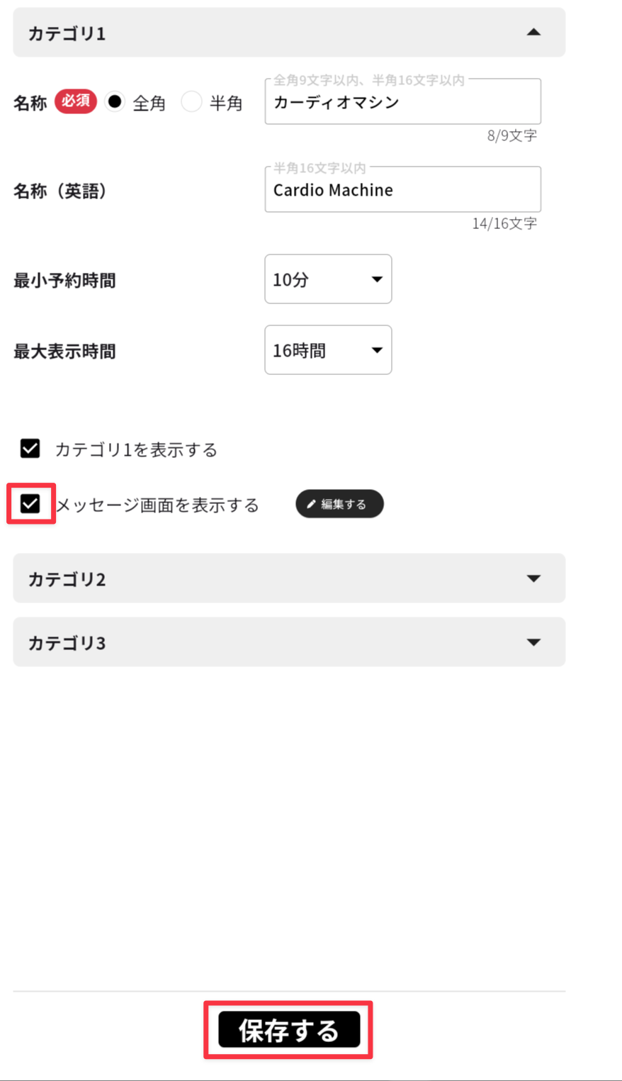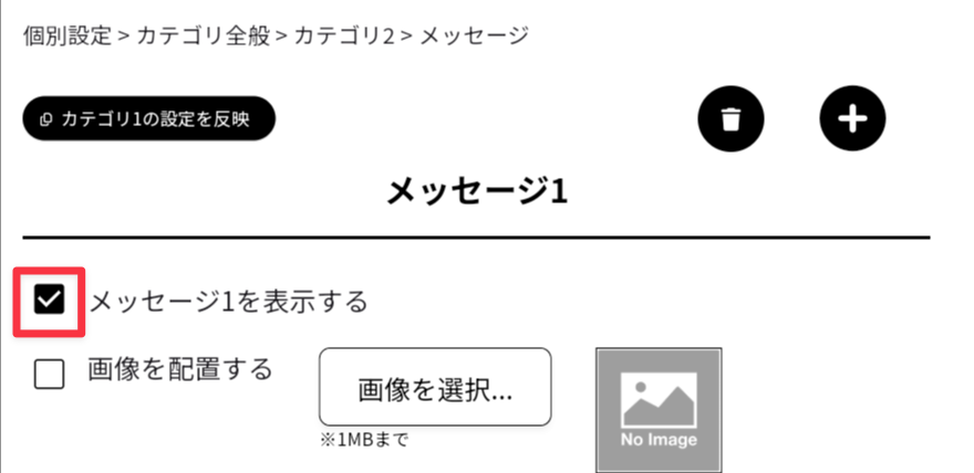 Tips:[メッセージ2][メッセージ3]に[メッセージ1]の設定をコピーする場合は、[カテゴリ1の設定を反映]をタップします。 - [保存する]をタップします。