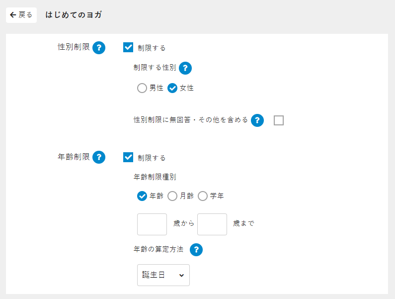 イベントプログラムの受講者を、性別や年齢で制限することができます。
