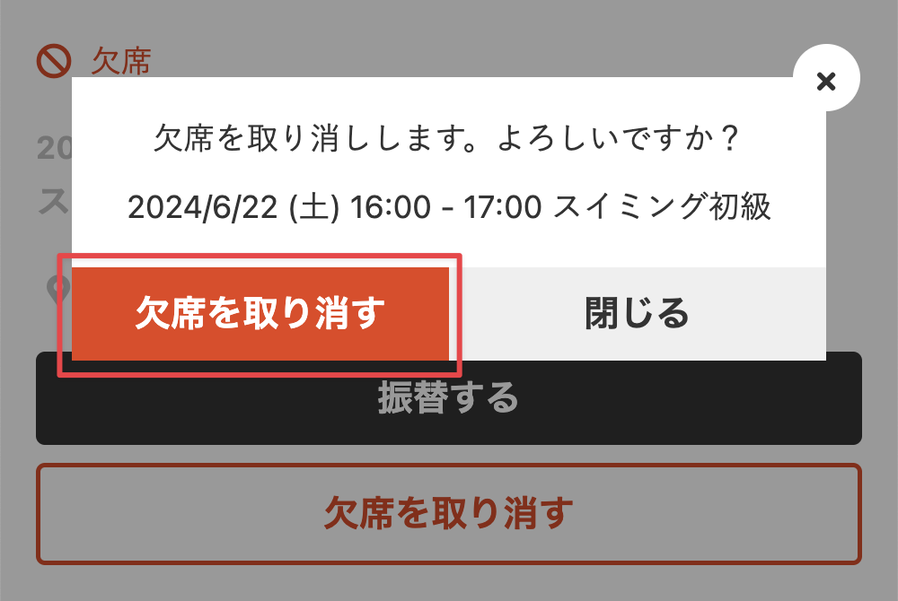 - 確認画面が表示されるので、[欠席を取り消す]をタップします。