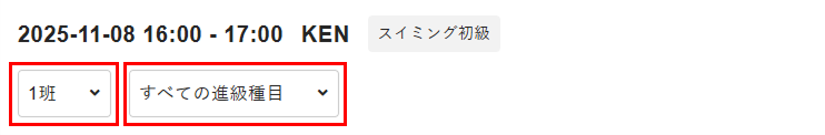 Note:[進級テストを実施]は、このレッスンのプログラムに進級種目が設定されているときだけ表示されます(「プログラムに進級種目を設定する(スクール)」を参照)。 - メンバー一覧を班や進級種目で絞り込み表示する場合、班や進級種目を選択します。