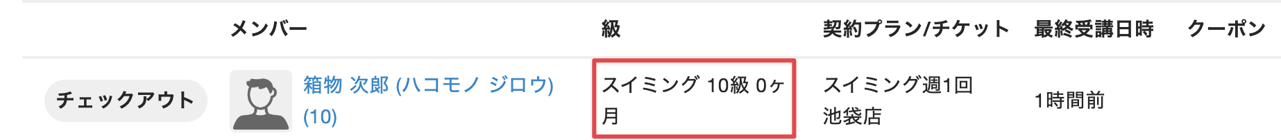 - 受講者の一覧に、現在の級と現在の級に進級してからの経過月数が表示されます。