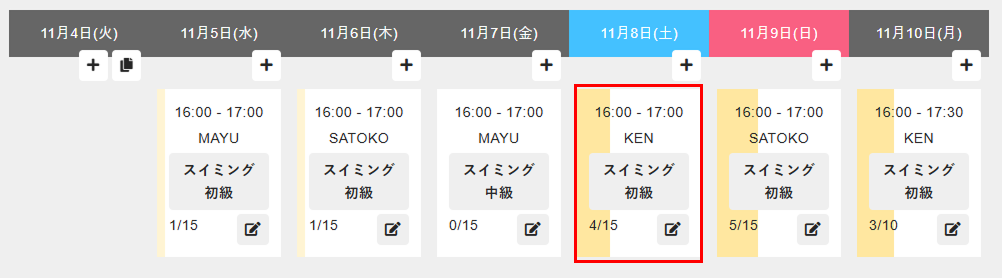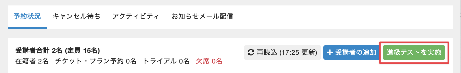 進級テストの結果は、予約スケジュール画面から進級テストを実施したレッスンに対して登録します。
