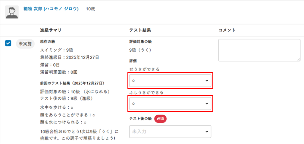 [テスト後の級]から進級テストの結果を反映した級を選択します。