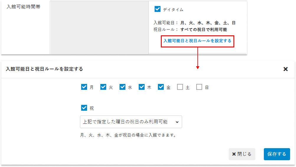 上記で指定した曜日の祝日のみ利用可能:曜日のチェックを入れた曜日だけ、祝日でも入館できます。チェックが入っていない曜日の祝日は予約できません。