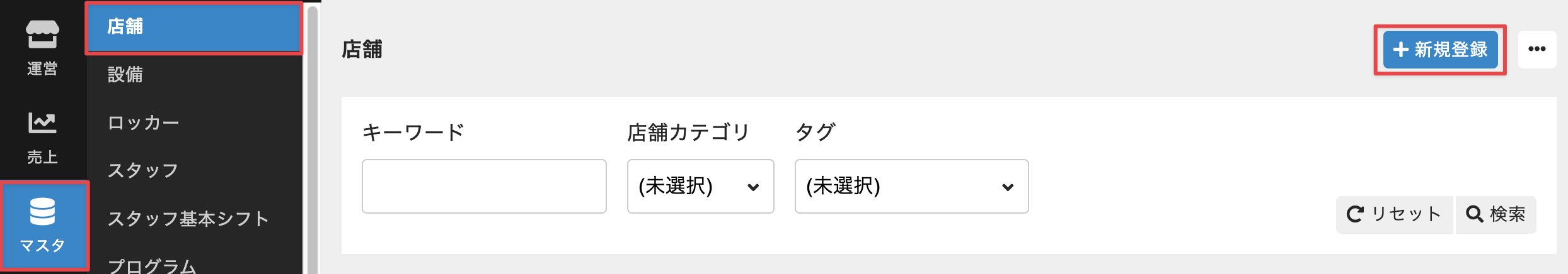 - 管理サイトのサイドバーから[マスタ]>[店舗]を選択し、店舗の一覧画面で[新規登録]をクリックします。