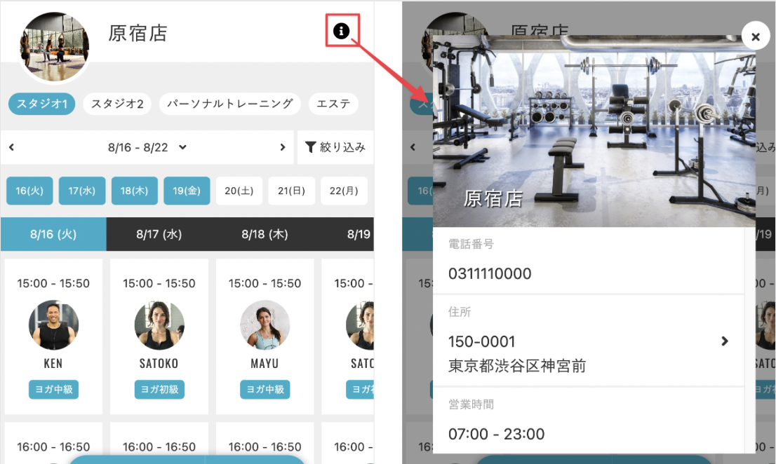 Tips:店舗の詳細情報は、予約画面の[i]をクリックして表示できます。