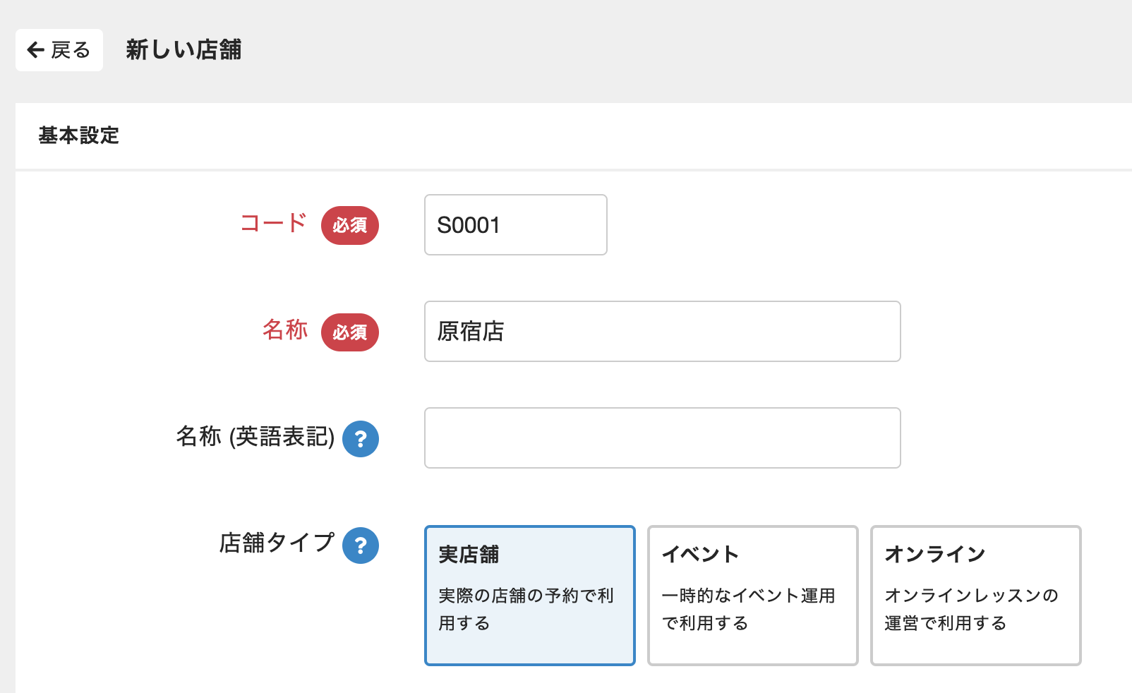 | コード(必須) | 店舗を識別するためのコード。 半角英数字で入力します。 初期値のコードをそのまま使用できます。必要に応じて変更してください。 |