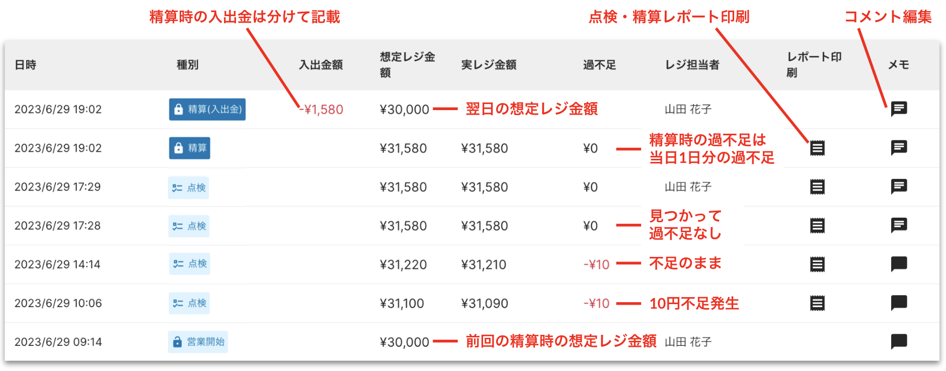 レジ管理履歴画面では、営業開始、入金、出金、点検、精算を行った時点での以下について時系列で確認することができます。