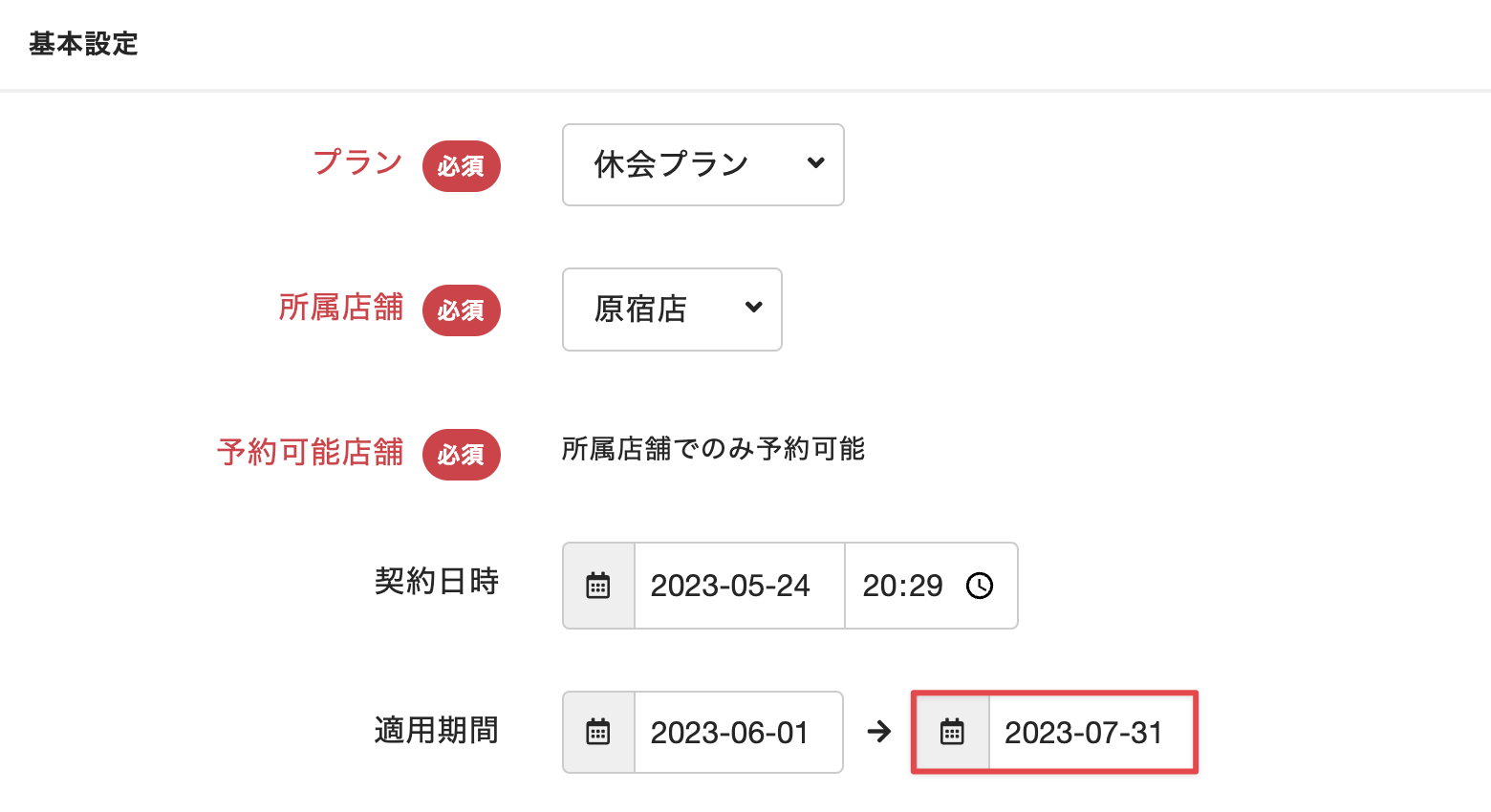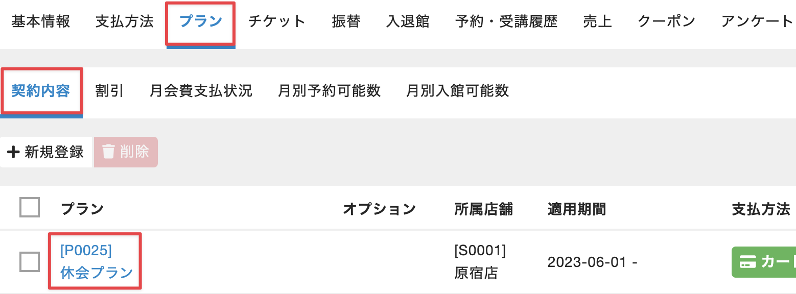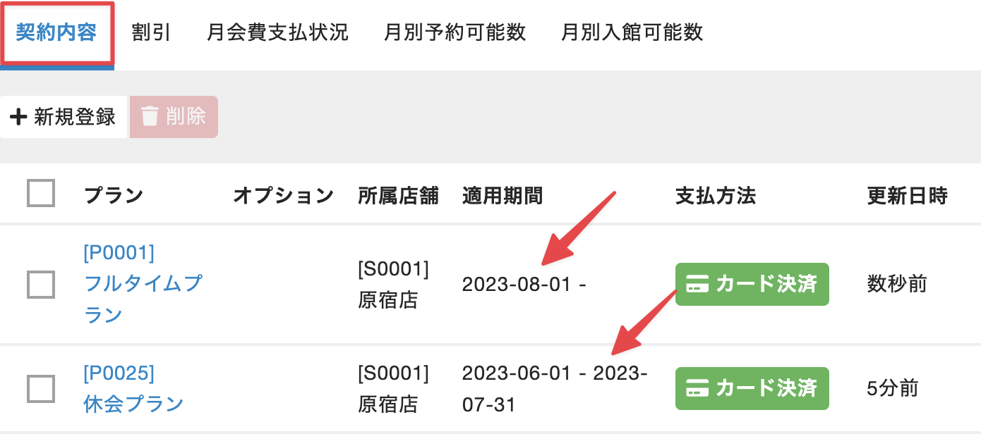 - [契約内容]タブを選択し、休会用のプランに終了日が設定され、復帰後のプランに開始日が設定されていることを確認します。