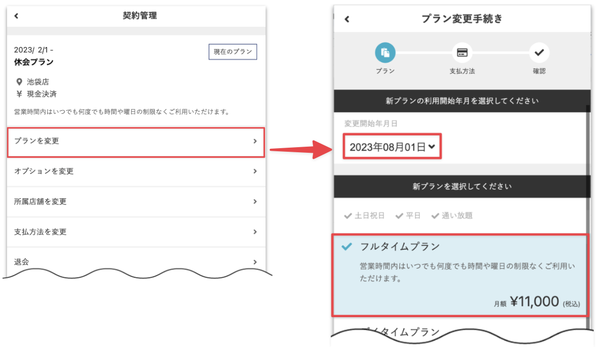 Note:プラン変更の締め切り日までに復帰手続きをした場合は、指定の月から復帰後のプランの月会費で請求が行われるようになります。