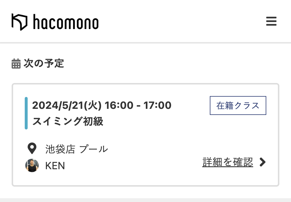 メンバーサイトでスクールの次の受講予定を確認するには、以下の手順を行います。
