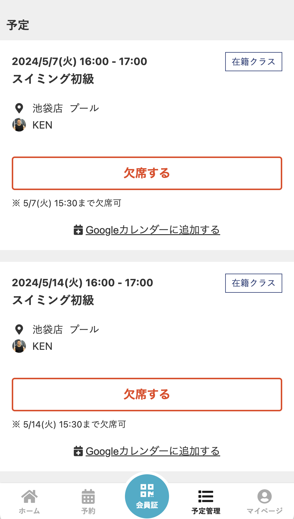 契約しているクラスのレッスンには[在籍クラス]が、欠席するレッスンには[欠席]が表示されます。