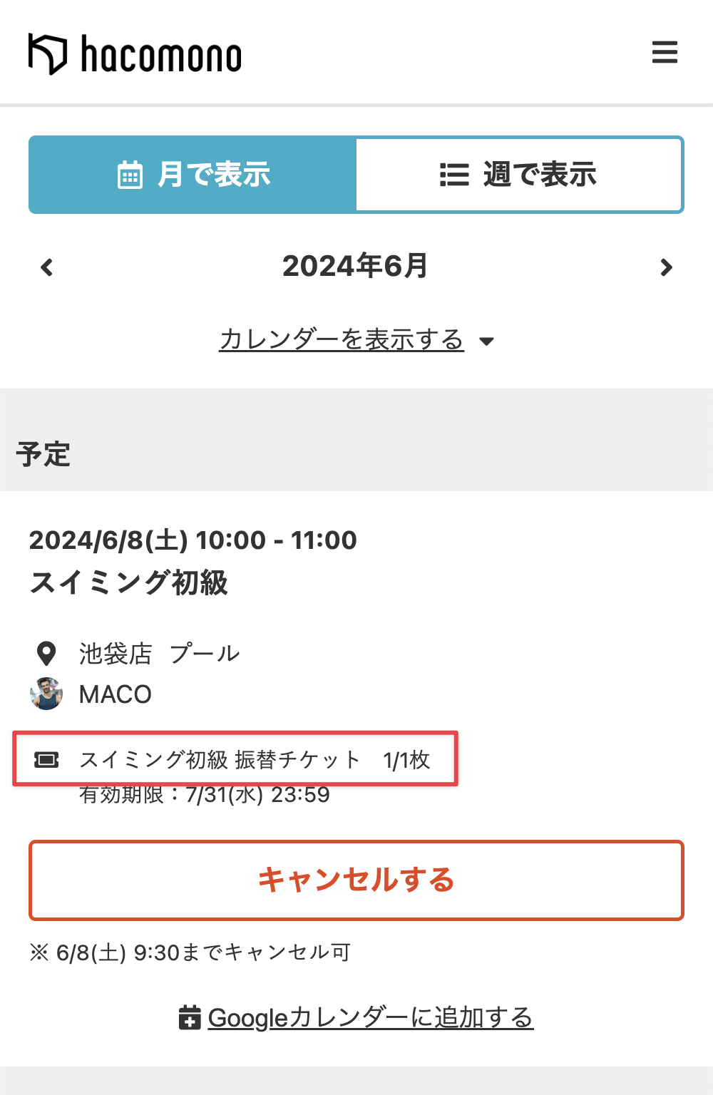振替予約のレッスンには予約に使用したチケットが表示されます。