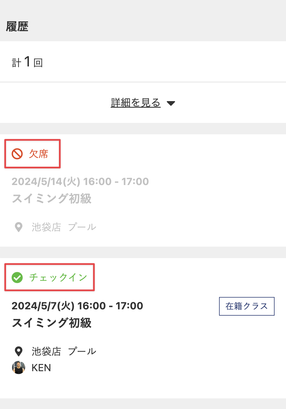 チェックインしたレッスンには[チェックイン]が、欠席したレッスンには[欠席]が表示されます。