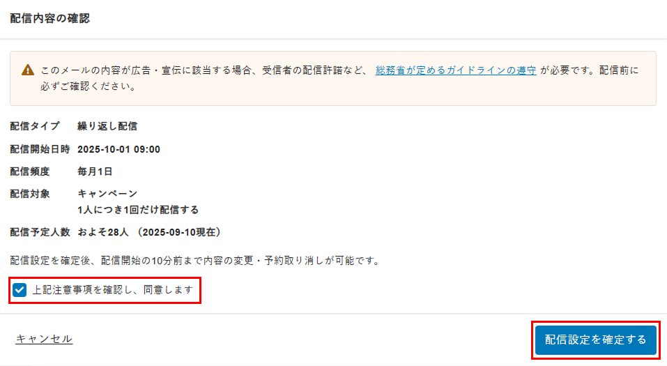 Note:作成途中で保存しておく場合は、[下書きとして保存]をクリックします。保存したメールは、メール配信画面のメール一覧で[ステータス]が[下書き]になります。下書きからメールの作成を再開するには、メール一覧の[件名]のリンクをクリックします。 - 配信内容を確認し、[上記注意事項を確認し、同意します]にチェックを入れて、[配信設定を確定する]をクリックします。