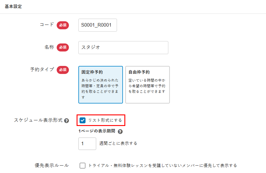 - [スケジュール表示形式]の[リスト形式にする]にチェックを入れます。