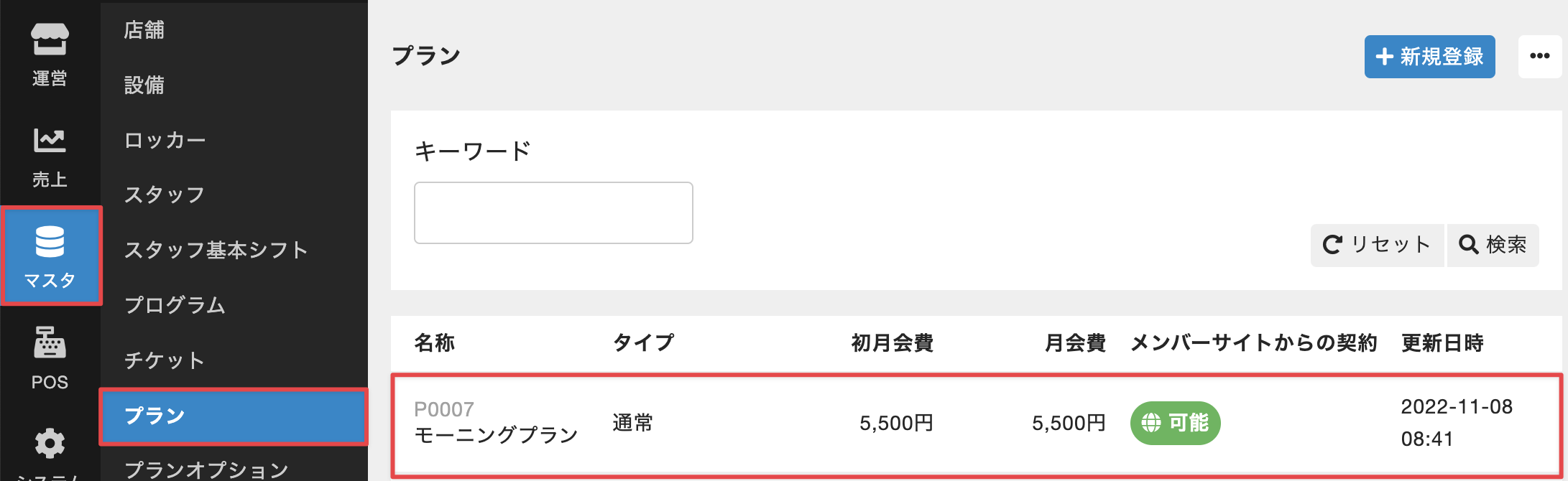 - 管理サイトのサイドバーから[マスタ]>[プラン]を選択し、プランの一覧画面でプランを選択します。