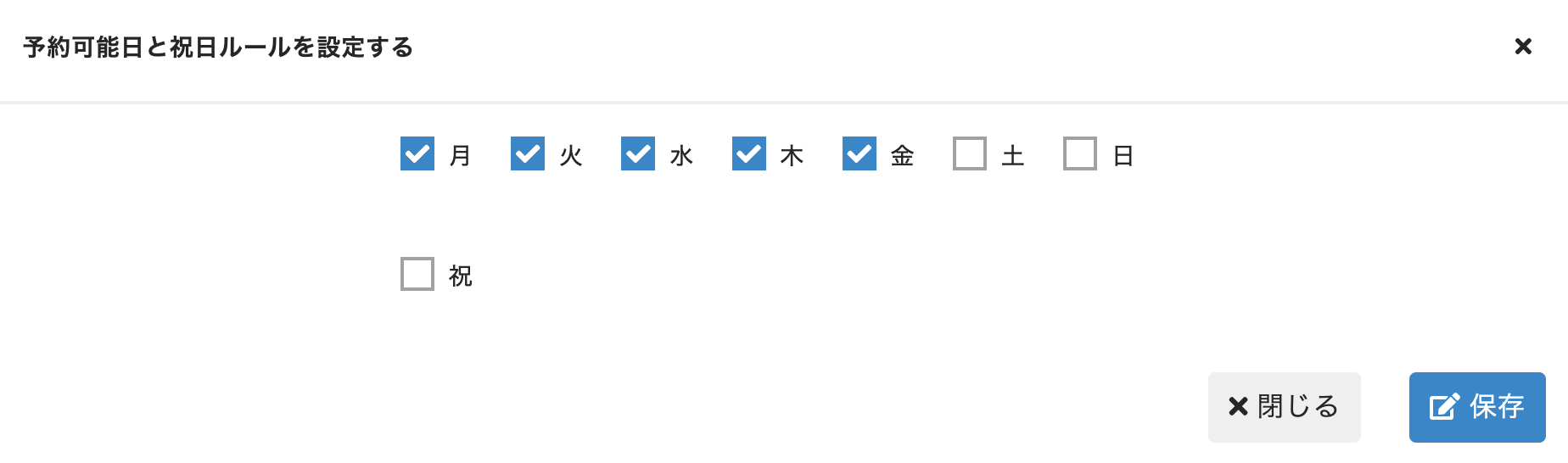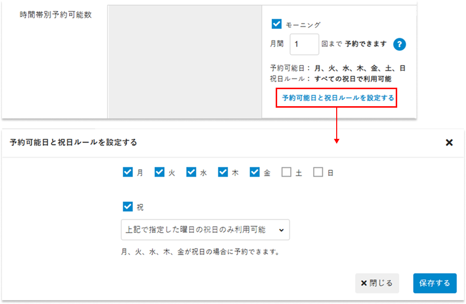 予約可能にする曜日にチェックを入れて、祝日の扱い(「設定項目」を参照)を設定し、[保存する]をクリックします。 -