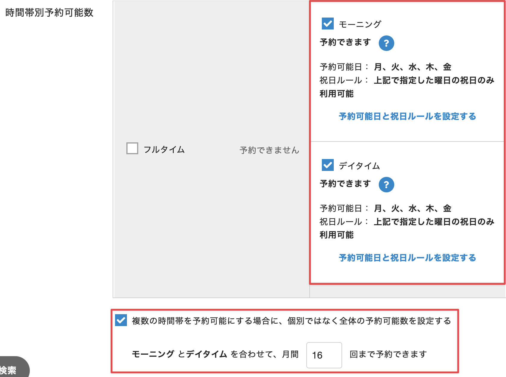 1つのプランで予約可能な時間帯が複数ある場合は、それぞれの時間帯にチェックを入れます。 - 予約可能な曜日を制限する場合、[予約可能日と祝日ルールを設定する]をクリックします。