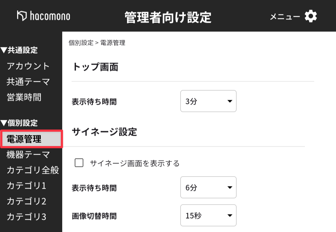トップ画面やサイネージ画面に切り替わるまでの待ち時間やサイネージの画像の設定は、電源管理で行います。