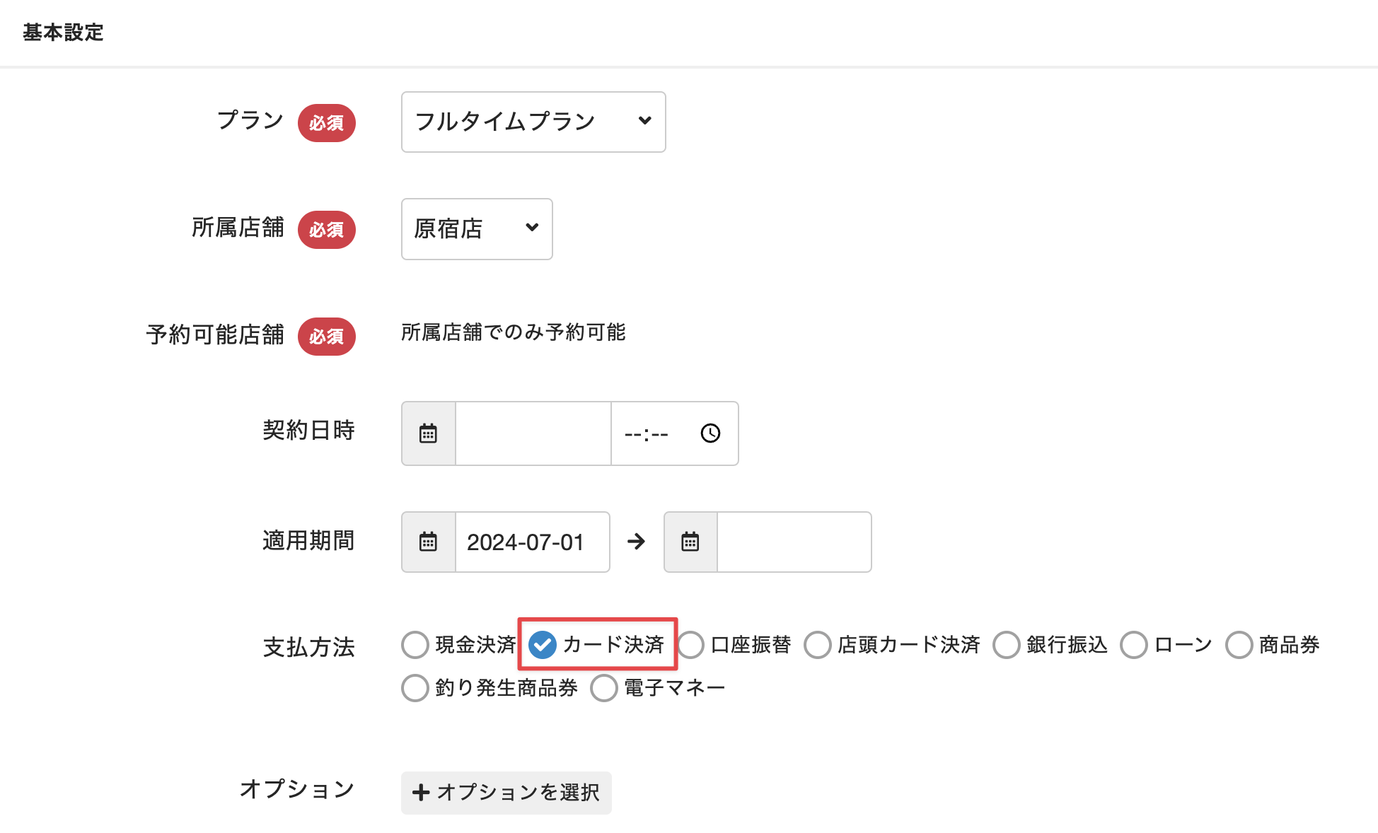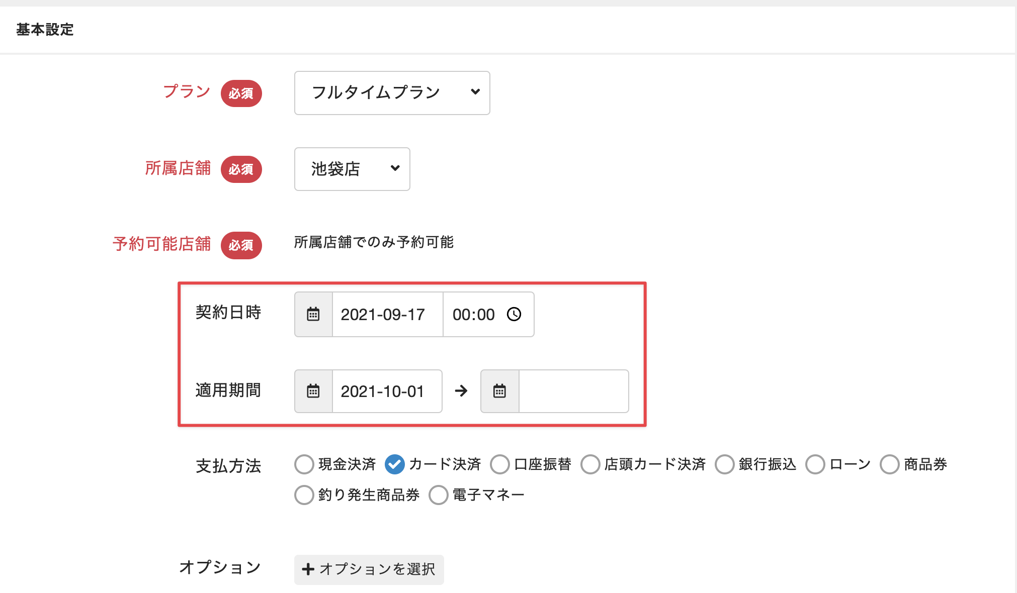 [契約日時](プランを登録した日)と[適用期間]の開始日(プラン契約開始日)によっては、手動で決済処理をする必要があります(「STEP 3:手動で決済処理をする(カード決済の場合)」、「STEP 3:手動で決済処理をする(書類手続きの口座振替の場合)」を参照)。 -