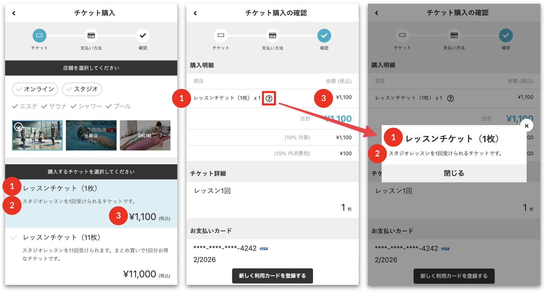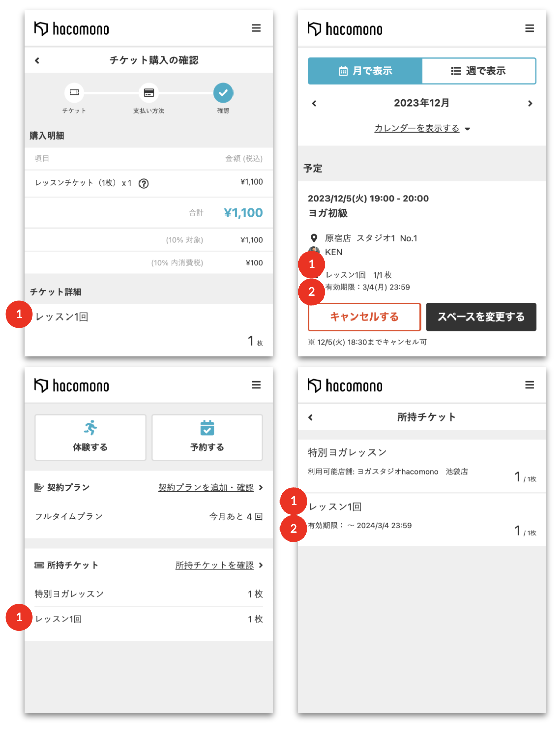 商品購入時に付与されるチケットと付与する枚数。 回数券などの複数枚付与されるチケット商品で1枚当たりの消化金額に端数が生じる場合(例:チケット3枚10,000円の場合、10,000円÷3枚=3,333円で1円の端数)、チケットを使用した予約または予約のキャンセル時点において開催日時が最も過去の予約レッスンのチケット消化金額に端数が加算されます(2024年10月1日以降に付与されたチケットから適用)。 |