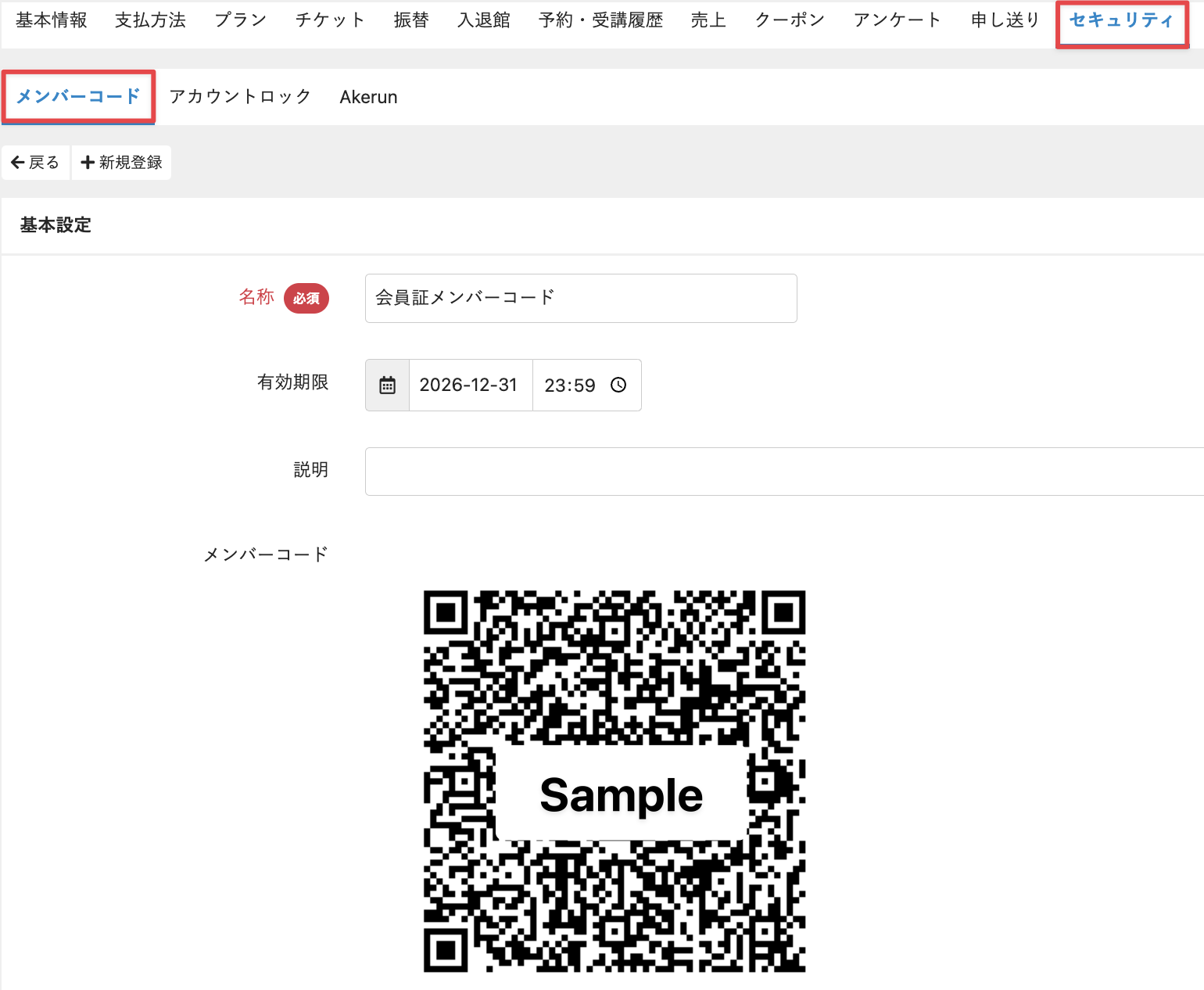 | 有効期限 | 固定メンバーコードの有効期限。 未入力の場合、無期限になります。 |