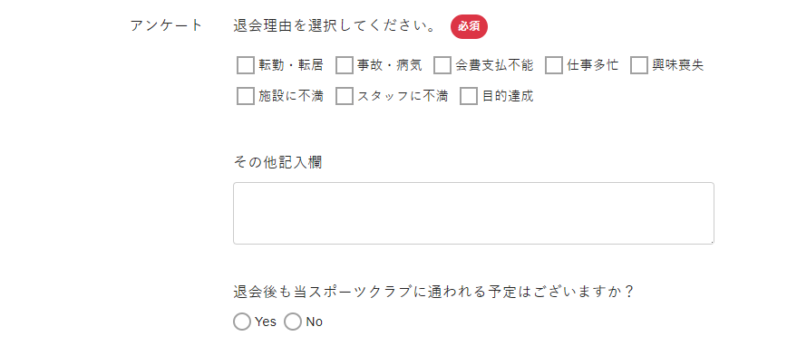 退会時アンケートを設定し、管理サイトからのアンケート記入を有効にしている場合、退会時アンケートの内容を入力します。