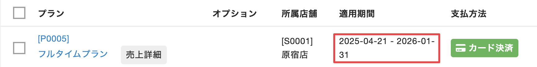 - メンバー詳細画面の[プラン]>[契約内容]タブが表示されるので、指定した退会日が[適用期間]に表示されていることを確認します。