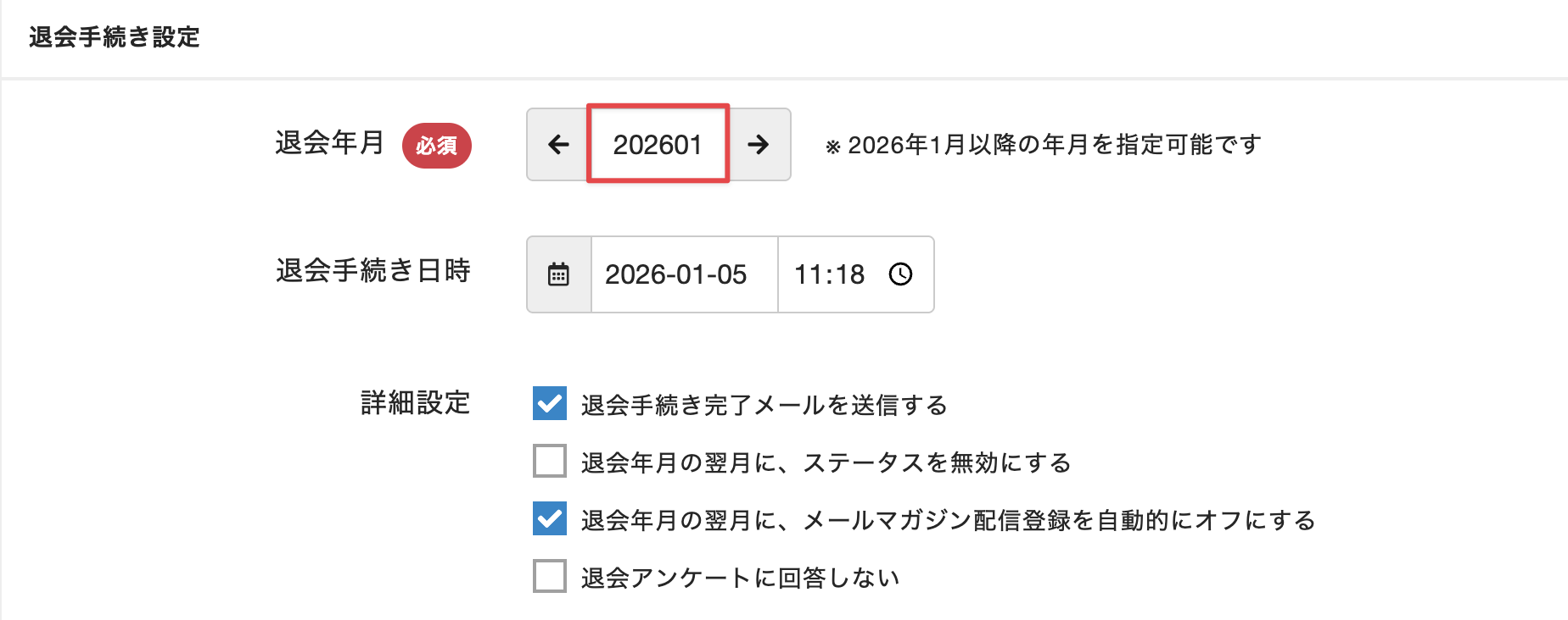 会員規約などで定められている当月の退会受付締切日をシステム設定の[契約変更・退会の締切]に設定することで(「全体設定を確認する」を参照)、退会手続き設定画面の退会年月が自動的に算出されます。 - [退会手続き日時]を入力します。