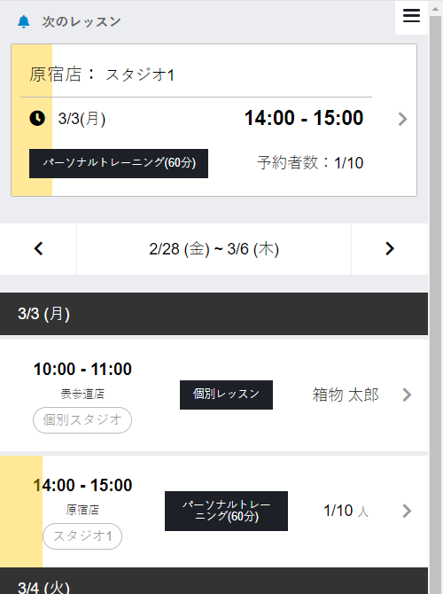 スタッフ管理サイトは、通常の管理サイトの機能を限定して使用できる、スタッフ個人向けの専用サイトです。スケジュール確認、シフト管理、レッスンのチェックイン機能など、レッスンに直接関係する機能を中心に利用できます。