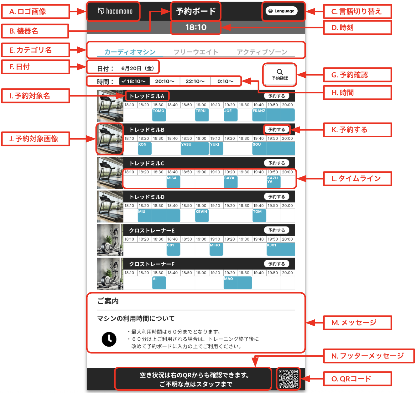 | G. 予約確認 | メンバーコード(QRコード)による認証後、予約の確認・キャンセル画面が表示されます(「hacomono連携で予約履歴を確認する(予約ボード)」「hacomono連携で予約をキャンセルする(予約ボード)」を参照)。 |