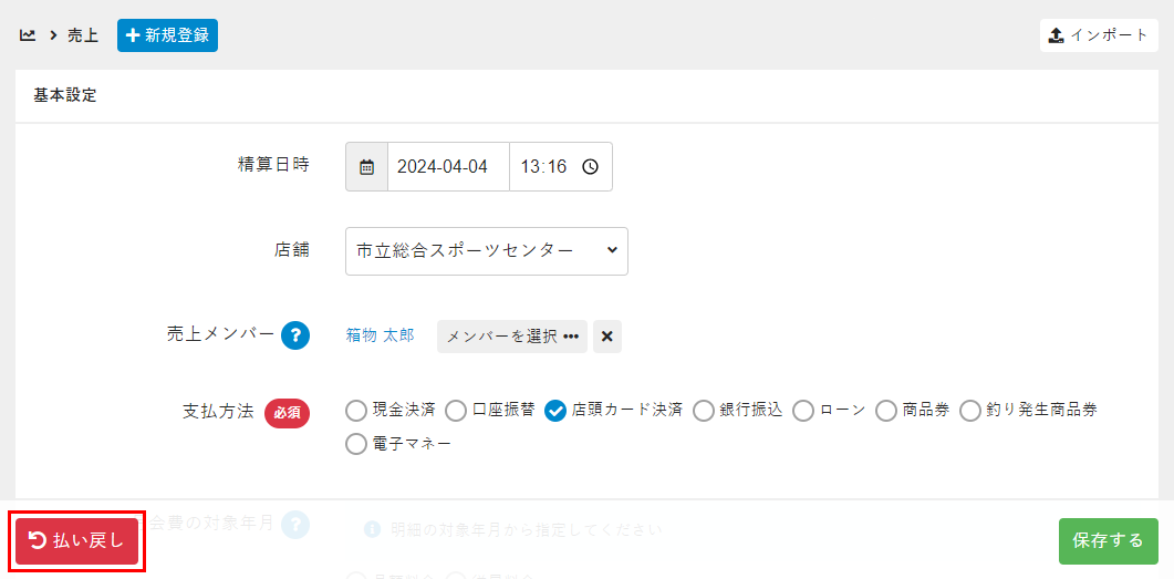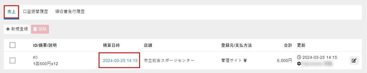 [売上]タブで、払い戻しが必要な項目の[精算日時]をクリックします。