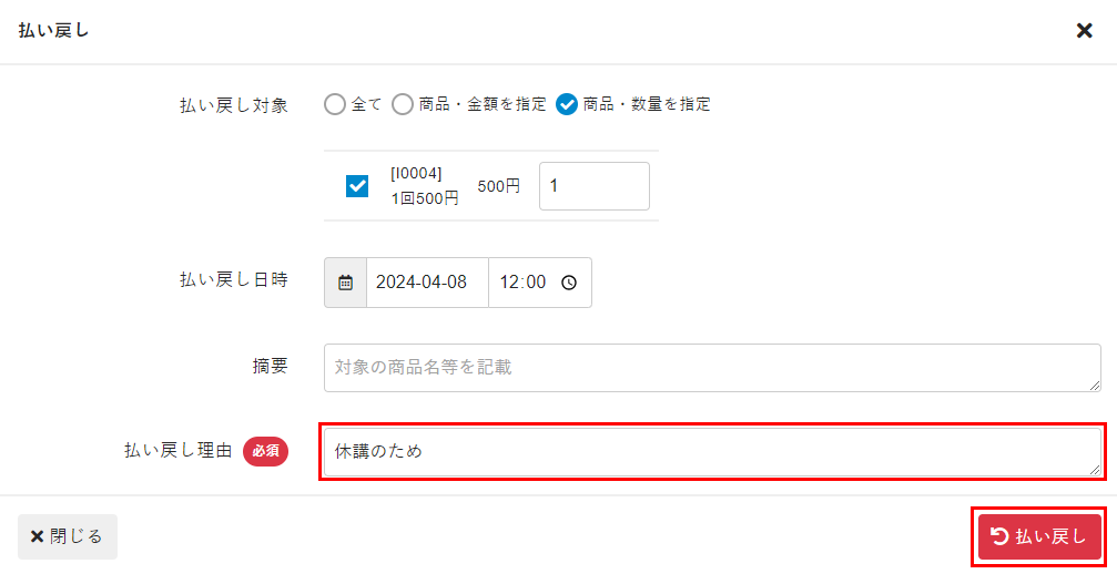 Note:払い戻し画面の詳細については、「管理サイトで払い戻し手続きする」を参照してください。 - 払い戻し理由を入力し、[払い戻し]をクリックします。