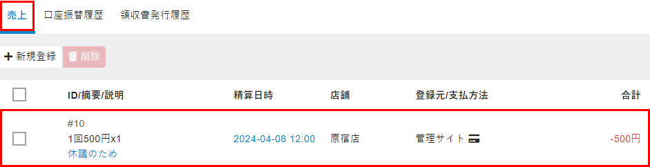 Note:管理サイトのサイドバーから[売上]>[売上]を選択し、該当の売上の[精算日時]をクリックした画面からも、売上を払い戻すことができます。 -