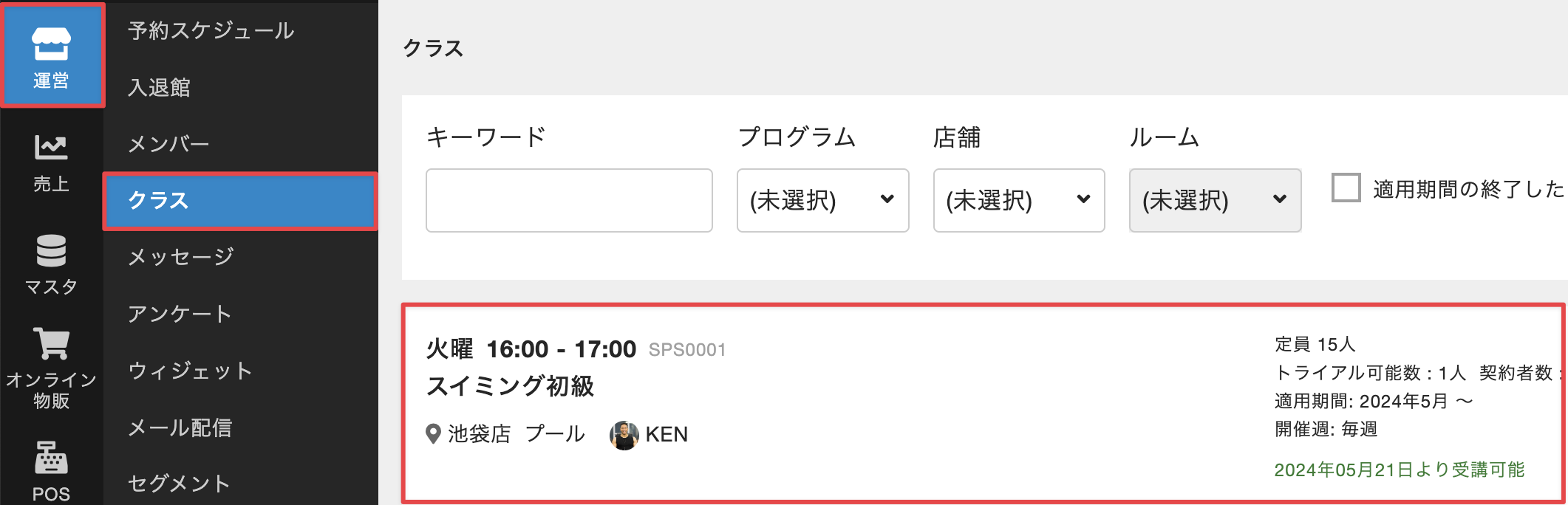 - 管理サイトのサイドバーから[運営]>[クラス]を選択し、クラスの一覧画面で対象のクラスを選択します。Tips:クラスの一覧の並び順は、店舗名 → 実施曜日(日 → 土)→ 実施時間の昇順となります。