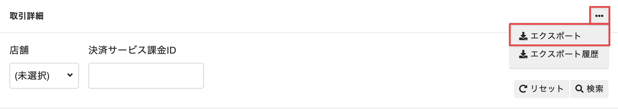 照合結果をエクスポートするには、[取引詳細]の[⋯]をクリックして[エクスポート]を選択します。