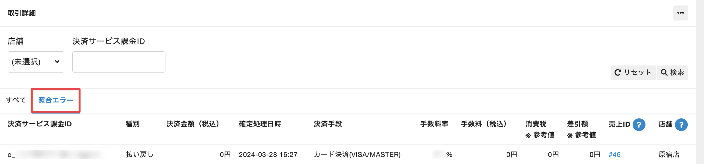 照合エラーの売上の決済手数料