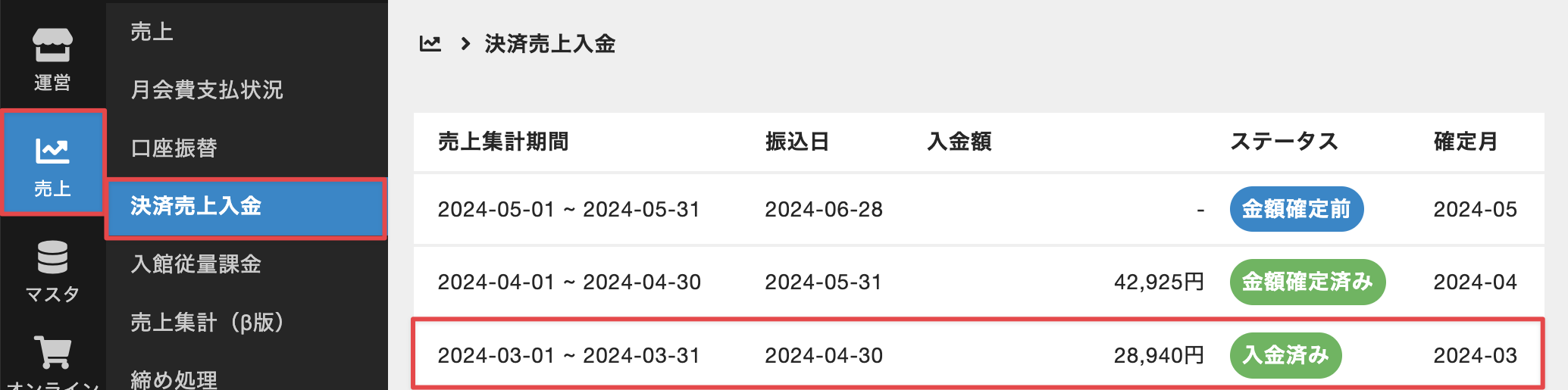 - 管理サイトのサイドバーから[売上]>[決済売上入金]を選択し、確認対象の売上集計期間を選択します。