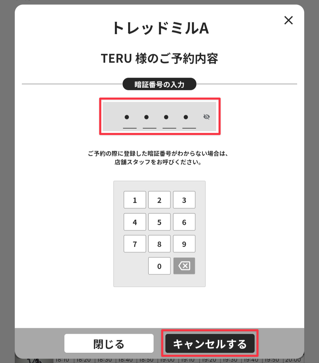 - 予約時に暗証番号を登録した場合、暗証番号をキーボードから入力し、[キャンセルする]をタップします。
