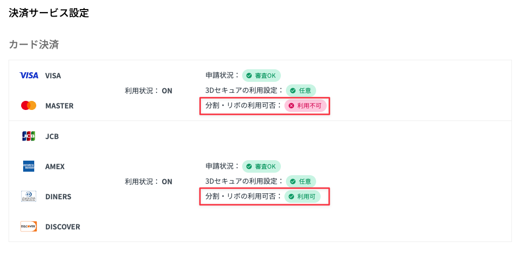 - 決済サービス設定画面の[カード決済]で[分割・リボの利用可否]の表示を確認します。
