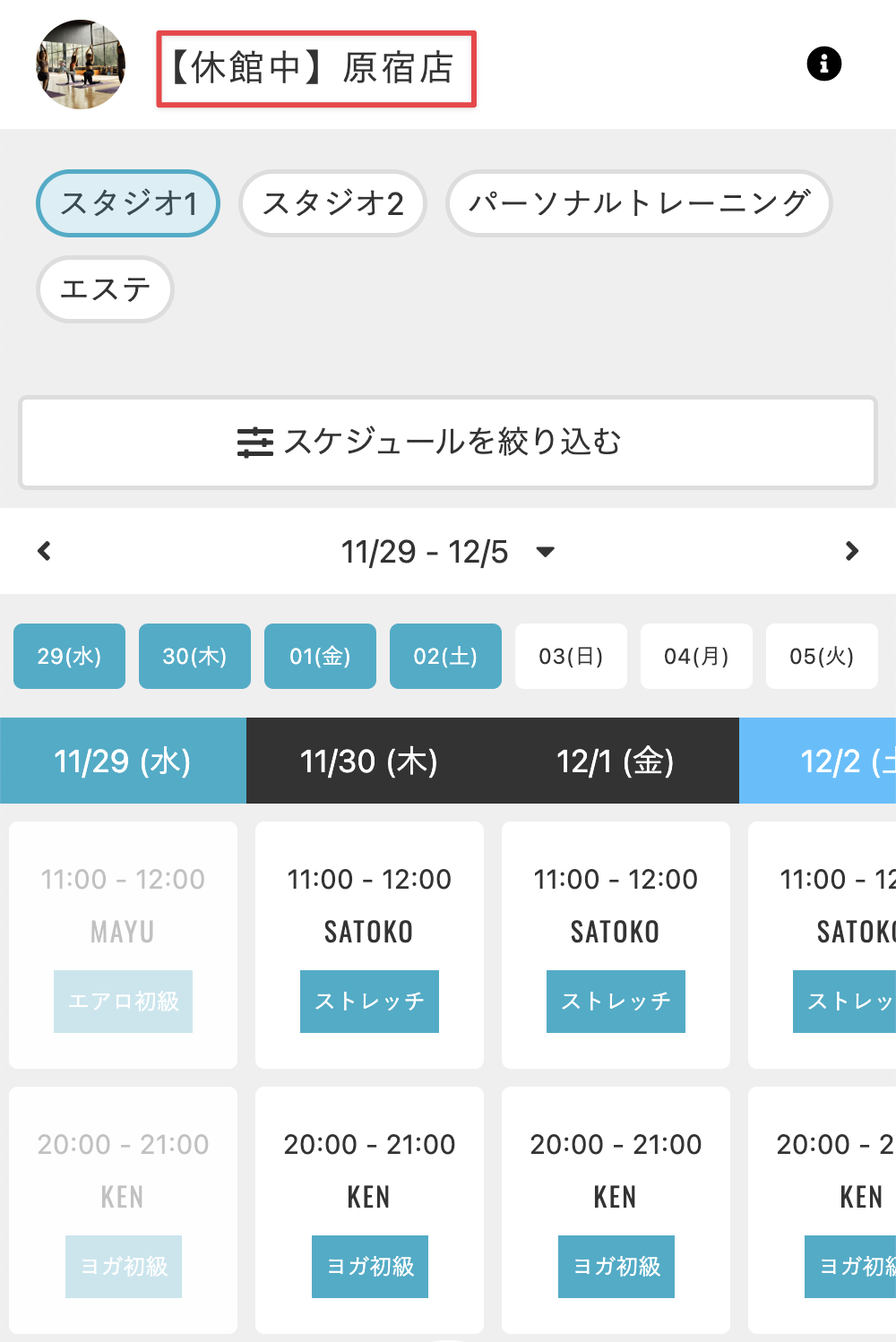 店舗マスタで名称を 休館中 など記載いただきますと、会員様の予約一覧上も大きく表示されます。