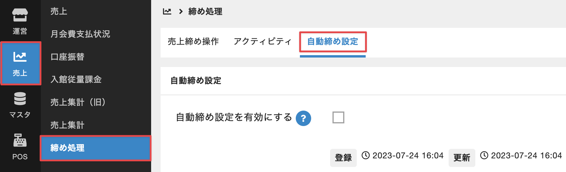 - 管理サイトのサイドバーから[売上]>[締め処理]を選択し、締め処理画面で[自動締め設定]タブを選択します。