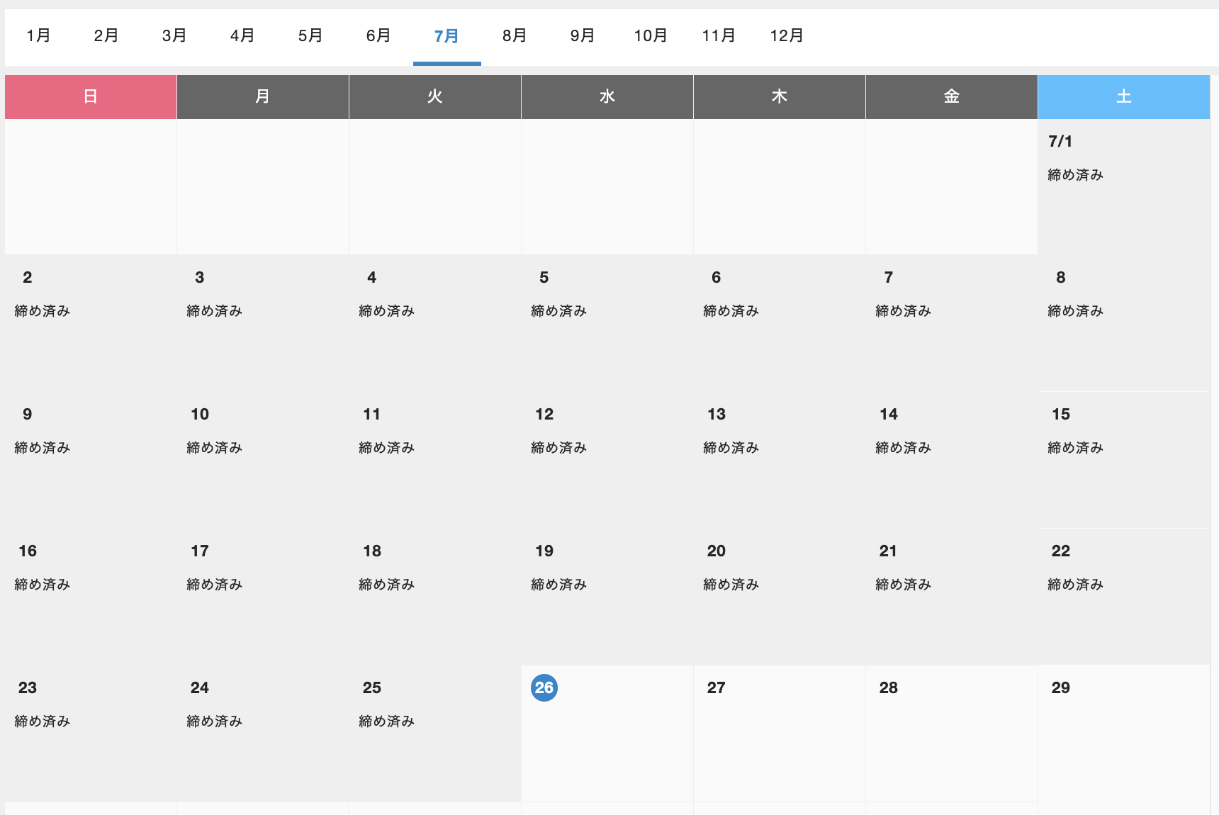 - 指定した日・期間の売上が締まり、カレンダーに「締め済み」が表示されます。