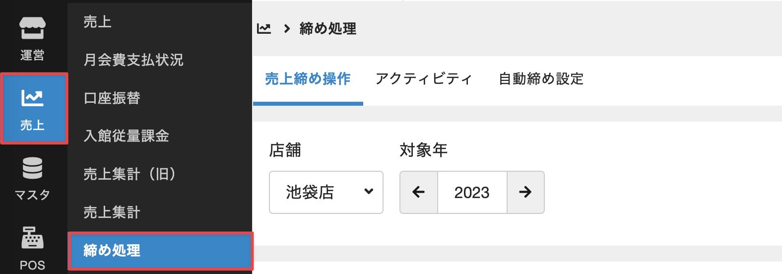 - 管理サイトのサイドバーから[売上]>[締め処理]を選択します。