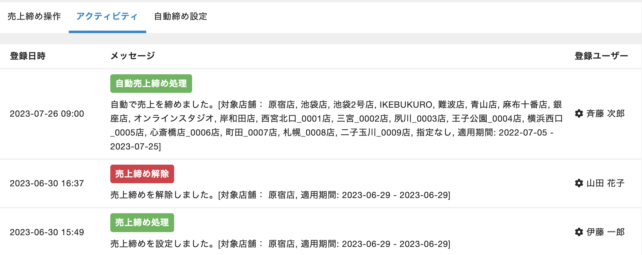 売上の締め処理や締め解除の操作は、ログに記録され、誰が行った操作かを後から確認することができます。