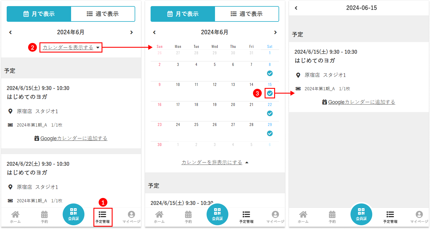 受講予定のある日は、カレンダーにチェックマークが付いています。チェックマークをタップして受講の詳細を確認できます。