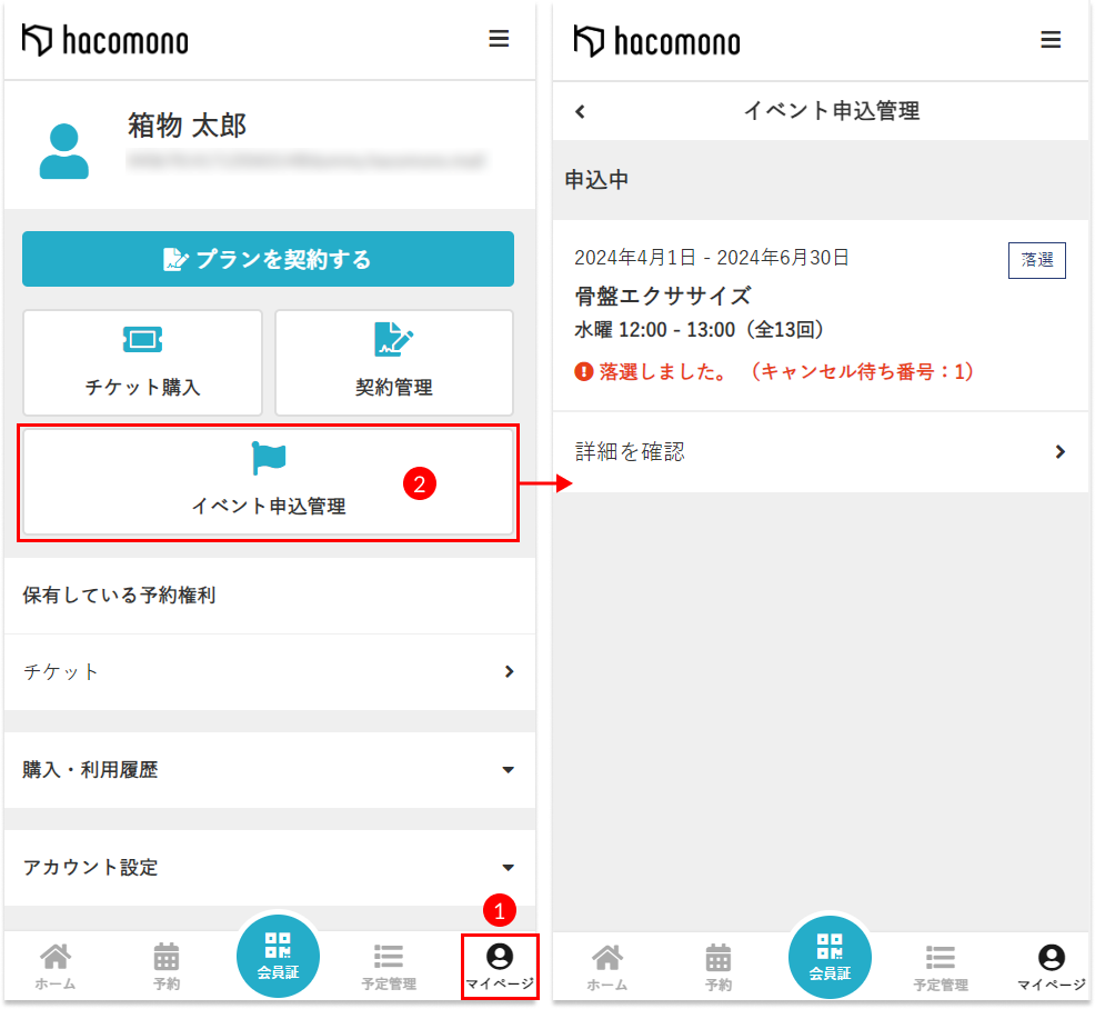キャンセル待ち番号は、画面下部の[マイページ]をタップし、[イベント申込管理]をタップすると表示されるイベント申込管理画面で確認できます。